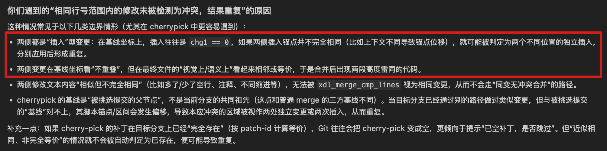 - 同一个类似的修改被cherrypick时代码出现重复
